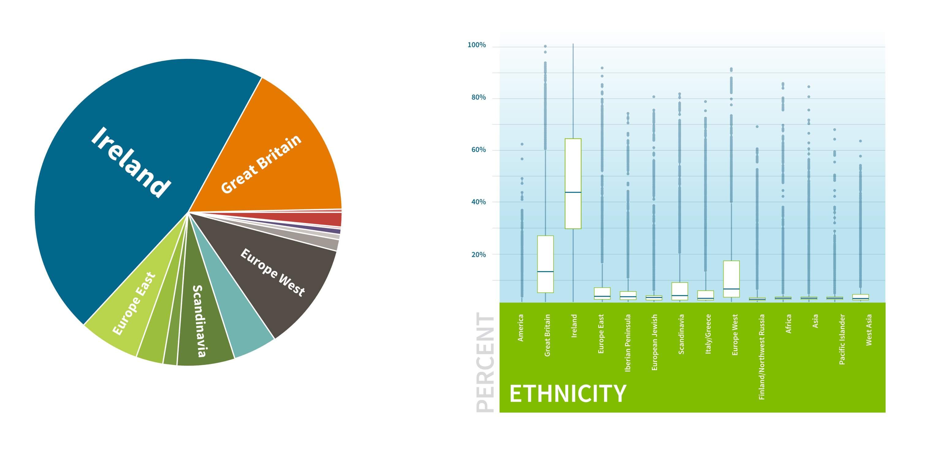 Here, we augment these DNA and pedigree-based insights even further with our new genetic communities feature (Figure 1.1). Instead of considering the IBD connection between each pair of customers in isolation, we simultaneously analyze more than 20 billion connections identified among over 2 million AncestryDNA customers as a large genetic network (described below in Section 3). Intuitively, because the estimated IBD connections between individuals are likely due to recent shared ancestry (within the past 10 generations), broader patterns in this large network likely represent recent shared history. The result is that we can identify clusters of living individuals that share large amounts of DNA due to specific, recent shared history. For example, we identify groups of customers that likely descend from immigrants participating in a particular wave of migration (e.g. Irish fleeing the Great Famine), or customers that descend from ancestral populations that have remained in the same geographic location for many generations (e.g. the early settlers of the Appalachian Mountains). Following the identification of these clusters of individuals in the entire network, we can then assign any AncestryDNA customer to one or more of these clusters based on their IBD with other AncestryDNA members. Such assignment can provide a customer with insight into their recent ancestral history, in some cases traceable back to a historical event.